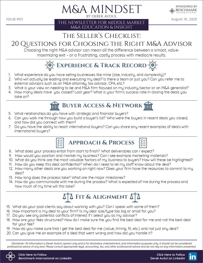 - The Seller's Checklist: 20 Questions for Choosing the Right M&A Advisor
