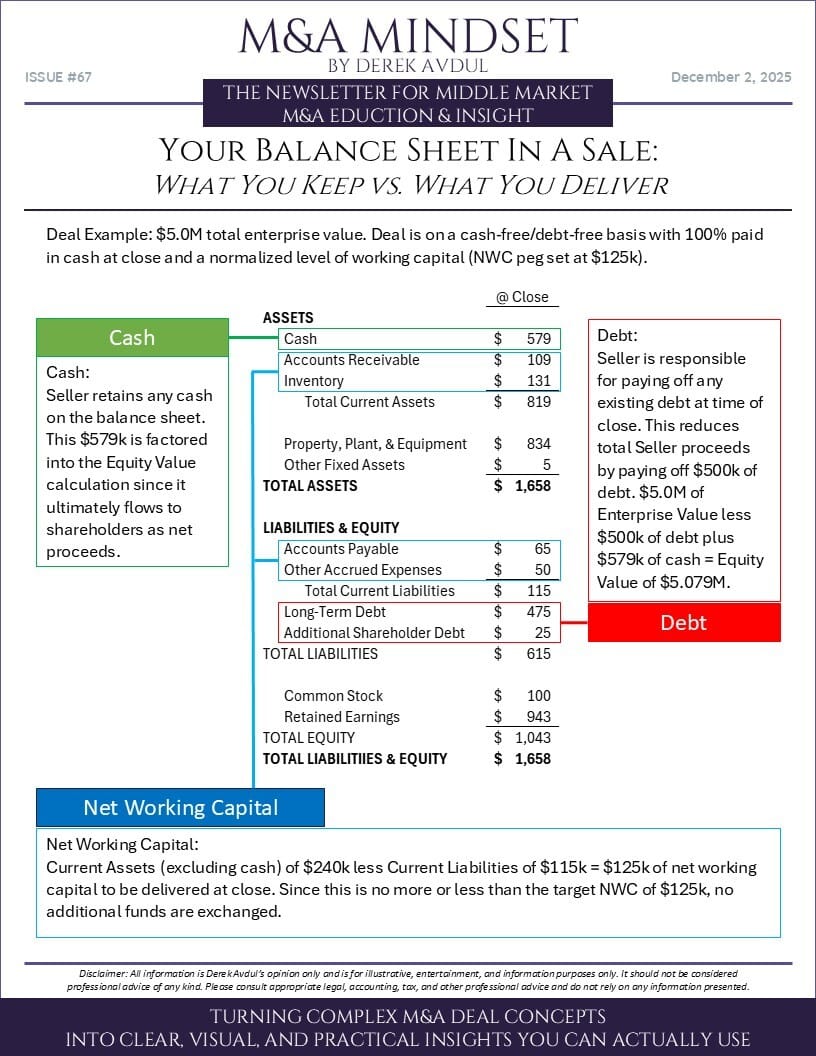 We're breaking down your balance sheet in a sale so you better understand what you keep vs. what you deliver to the buyer at close. Plus, we answer the question of what makes a good M&A advisor. And, as always, curated articles, learning resources, fun M&A merch, and something to get you to lighten up a bit...